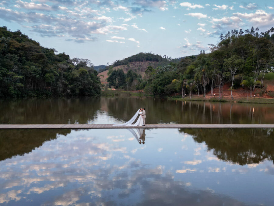 Nossa capela envidraçada oferece uma visão 360º da cerimônia, enquanto a noiva percorre uma passarela de 80 metros sobre a lagoa, criando um momento inesquecível.